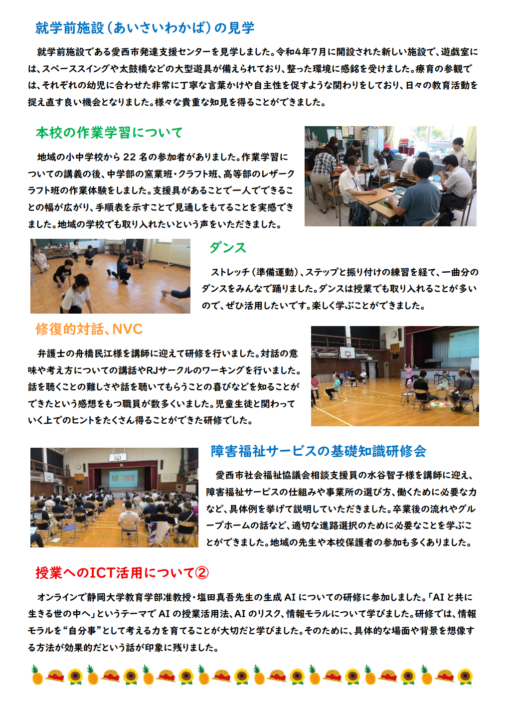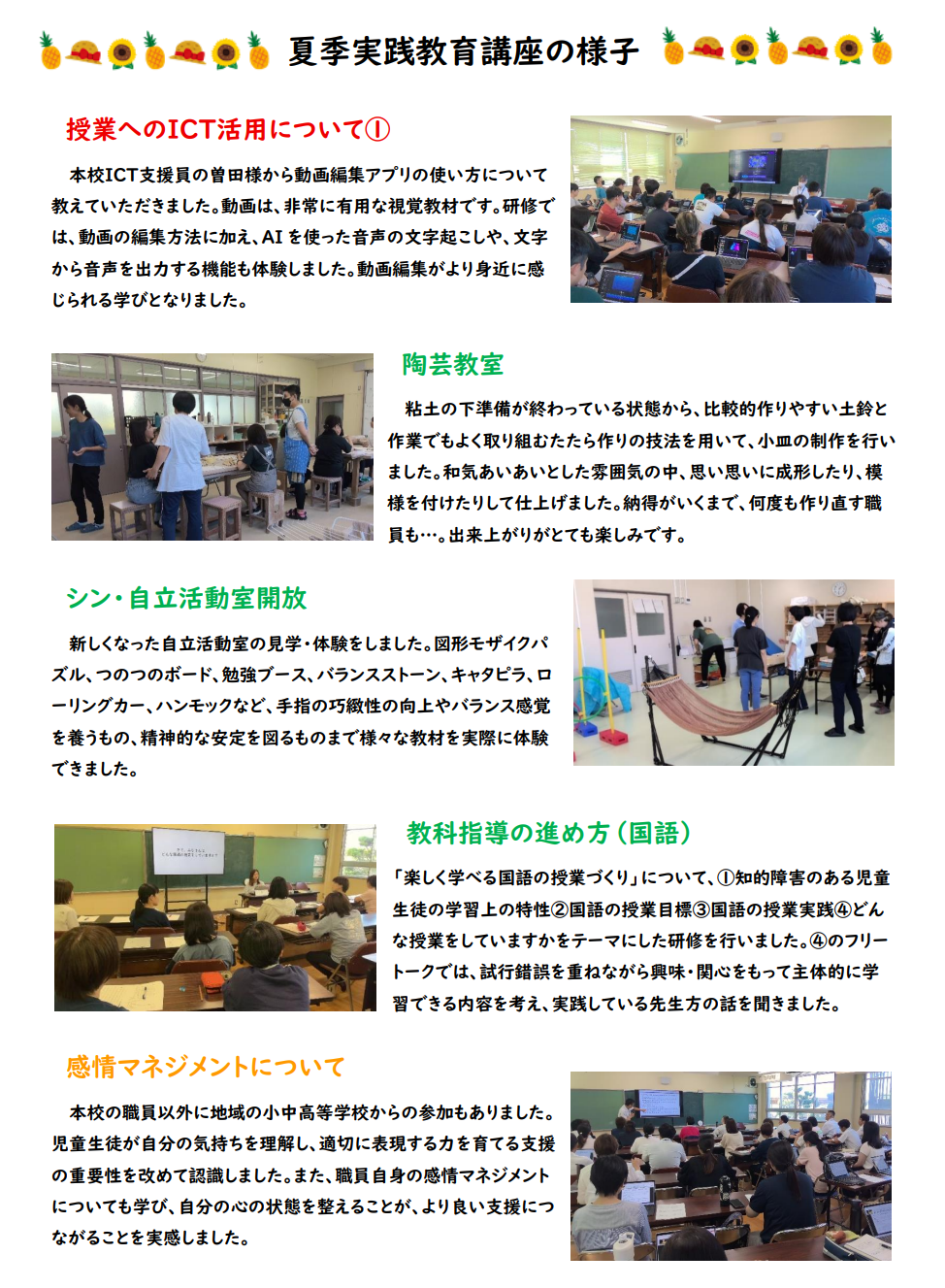 お知らせ 夏季実践教育講座(職員研修)を実施しました 2025年9月2日 夏休みを利用して職員(一部保護者向け)研修を行いました。 ICT教育や教科指導、進路に関する研修など、11講座が開設されました。 どの講座も熱心に話を聞いたり、積極的に質問をしたりして有意義な時間となりました。