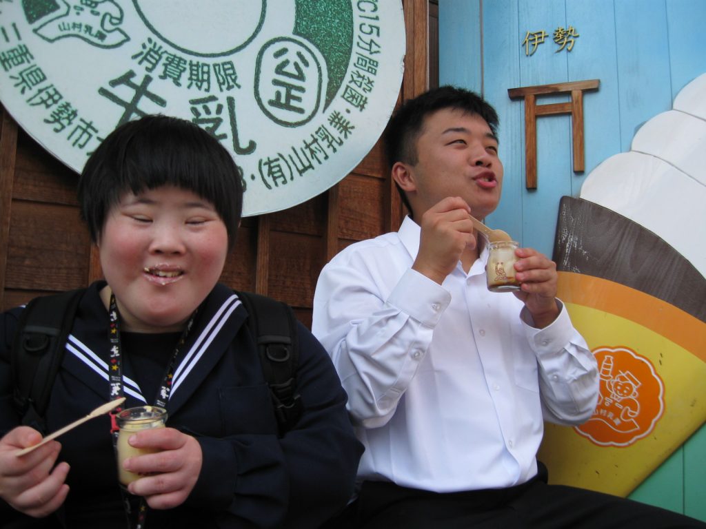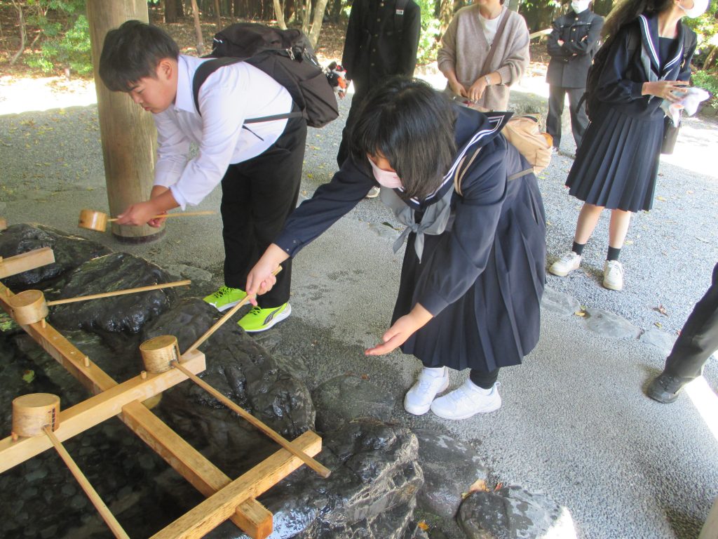 2日目は、まず伊勢夫婦岩めおと横丁で伊勢木綿を表紙に使った御朱印帳作りの体験を行いました。世界に一つだけのオリジナルの御朱印帳には、一人一人の個性が詰まっていました。次に、伊勢神宮へ御参拝をしました。先ほど作った御朱印帳に御朱印をもらったり、厳かな雰囲気を感じながら御正宮で参拝をしました。最後におかげ横丁で食べ歩きやお土産の購入を楽しみ、日程を終えました。